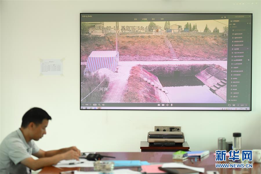 7月17日,在岳陽市華容縣治河渡鎮(zhèn)防汛抗旱指揮所,大屏實時顯示新華垸三門閘附近情況。為力爭安全度汛,湖南省岳陽市華容縣織密人防、物防、技防“三防”網絡,加強應急值守和巡查排險工作,采取“以船代倉”“以車代倉”等多種方式靈活儲備防汛物資,在險工險段布置攝像頭實時監(jiān)控,利用無人機對人員難以到達的位置進行巡查。新華社記者陳澤國攝