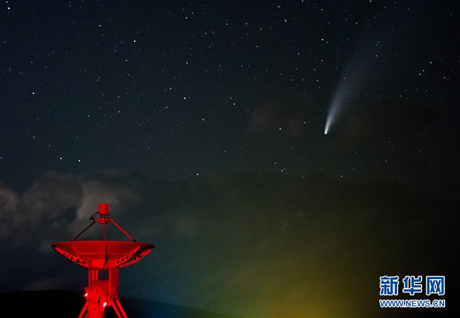 7月18日晚,在明安圖觀測基地,尼歐懷茲彗星劃過天際。7月18日晚至19日凌晨,在位于內(nèi)蒙古錫林郭勒盟正鑲白旗境內(nèi)的國家天文臺(tái)明安圖觀測基地,尼歐懷茲彗星劃過天際。在明安圖觀測基地內(nèi),排列著100面白色的拋物面天線。這個(gè)龐大的天線陣列便是草原“天眼”——明安圖射電頻譜日像儀。草原“天眼”持續(xù)接收太陽射電輻射,然后由科研人員進(jìn)行數(shù)據(jù)分析研究,對(duì)空間環(huán)境監(jiān)測、太陽活動(dòng)預(yù)報(bào)均有重要作用。新華社記者連振攝