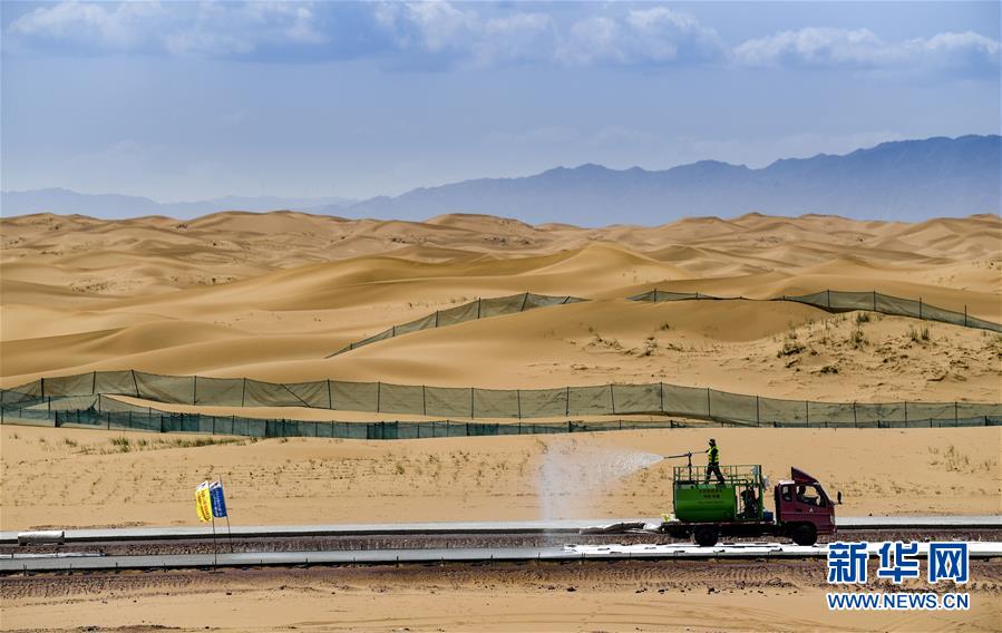 7月10日,工人在位于寧夏境內(nèi)的烏瑪高速青銅峽至中衛(wèi)段A9標(biāo)段施工。盛夏時(shí)節(jié),位于寧夏境內(nèi)的烏瑪(內(nèi)蒙古烏海市至青?,斍呖h)高速青銅峽至中衛(wèi)段正在抓緊施工建設(shè)。該路段主線全長122.9公里,其中穿越騰格里沙漠腹地的18公里公路是寧夏建設(shè)的首條沙漠高速公路,預(yù)計(jì)2021年建成通車。新華社記者馮開華攝
