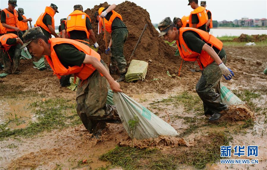 7月11日,武警戰(zhàn)士在江西省鄱陽縣鄱陽鎮(zhèn)江家?guī)X村搬運沙袋。新華社記者周密攝