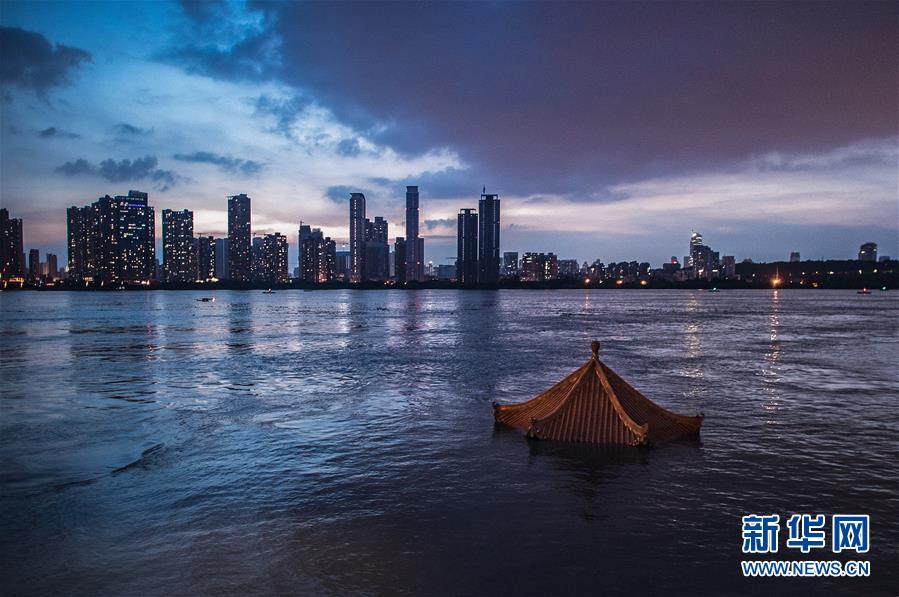 上漲的江水即將淹沒武昌黃花磯涼亭(7月13日攝)。7月13日17時,長江干流漢口站水位達28.74米,較之前的洪峰水位28.77米出現(xiàn)輕微下降。長江中下游洪水洪峰順利通過漢口江段。新華社記者肖藝九攝