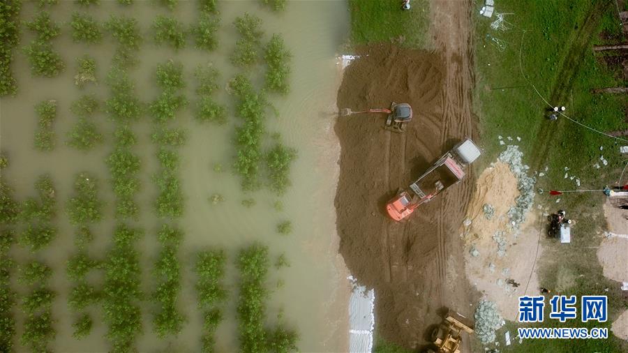 7月20日,在永固垸西線防洪大堤,工作人員處置滲漏險情(無人機照片)。