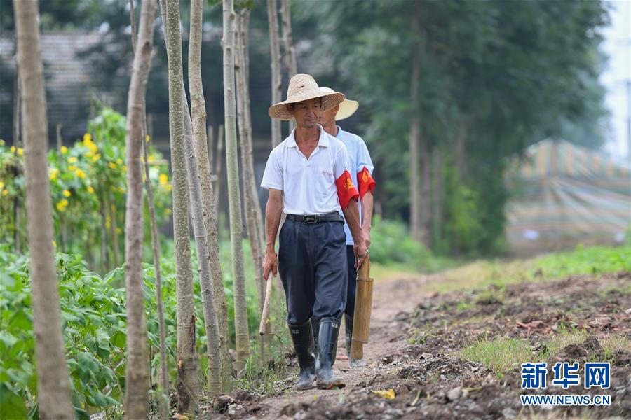 7月20日,在永固垸西線防洪大堤,工作人員巡堤查險(xiǎn)。新華社記者陳澤國(guó)攝