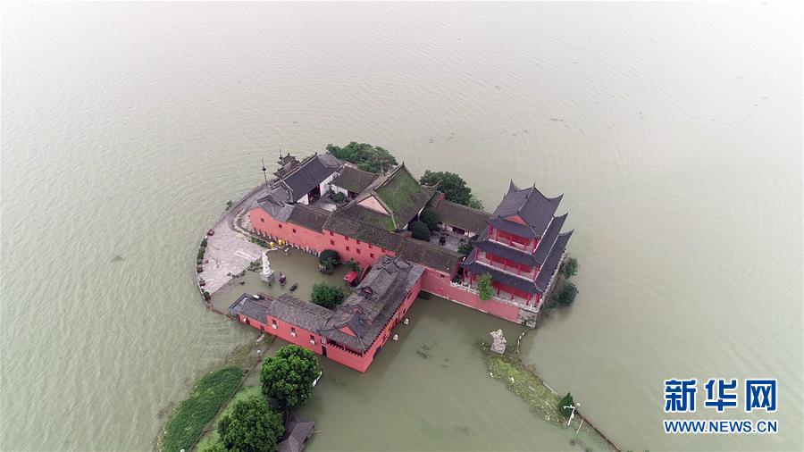 7月21日在安徽省合肥市巢湖邊拍攝的被水淹的建筑(無(wú)人機(jī)照片)。當(dāng)日10時(shí)24分,巢湖中廟站水位達(dá)到13.36米,該水位系巢湖洪水設(shè)防的百年一遇標(biāo)準(zhǔn)。新華社記者屈彥攝