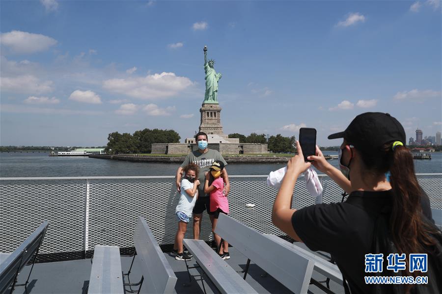 7月20日,參觀者在美國紐約前往自由島的游艇上拍照留念。美國紐約市20日繼續(xù)推進經(jīng)濟重啟計劃,宣布開始進入解封新階段,進一步允許部分低風險文娛活動重啟。自由女神像所在的自由島對公眾開放,但雕像內部和博物館仍關閉。新華社記者王迎攝