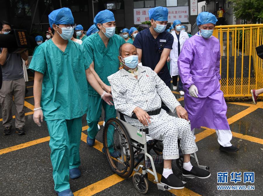 7月21日,武漢大學(xué)人民醫(yī)院醫(yī)護(hù)人員護(hù)送崔先生出院。新華社記者程敏攝