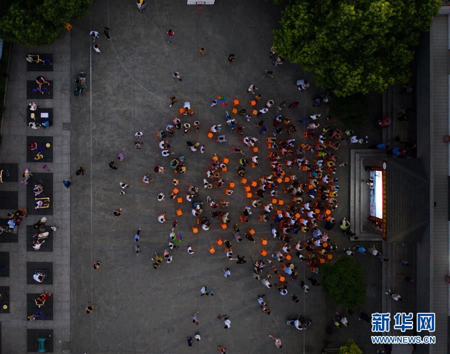 7月21日,“衛(wèi)家班皮影戲”劇團(tuán)的藝人們在和睦橋村的文化禮堂前為村民們上演傳統(tǒng)皮影戲,豐富鄉(xiāng)村百姓夏季文化生活(無人機(jī)照片)。新華社記者徐昱攝