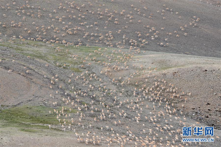 7月17日在西藏尼瑪縣榮瑪鄉(xiāng)附近拍攝的藏羚羊群。2000年,西藏羌塘自然保護(hù)區(qū)晉升為國家級自然保護(hù)區(qū)。20年來,經(jīng)過西藏各級各部門的不懈努力,羌塘國家級自然保護(hù)區(qū)內(nèi)的重點(diǎn)保護(hù)野生動物種群數(shù)量明顯增加,其中,藏羚羊種群數(shù)量由原來的5至7萬只,恢復(fù)到目前的15萬只以上。羌塘國家級自然保護(hù)區(qū)核心地帶的西藏尼瑪縣榮瑪鄉(xiāng)附近,目前就有近6萬只藏羚羊。新華社記者覺果攝