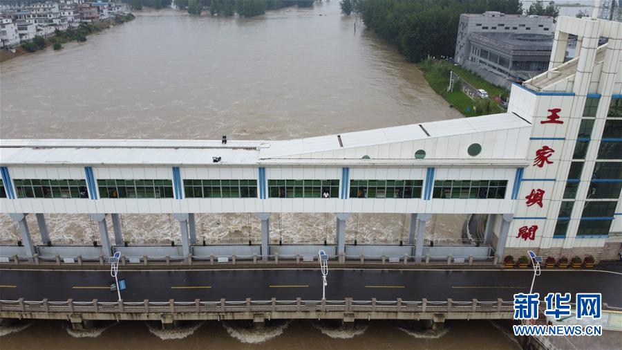 這是7月22日在安徽省阜南縣拍攝的淮河王家壩閘(無人機(jī)照片)。7月22日14時(shí),淮河王家壩水位降至28.73米,超警戒水位1.23米,低于保證水位0.57米。新華社記者張端攝