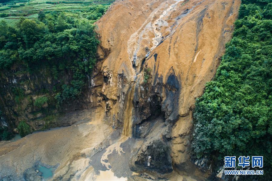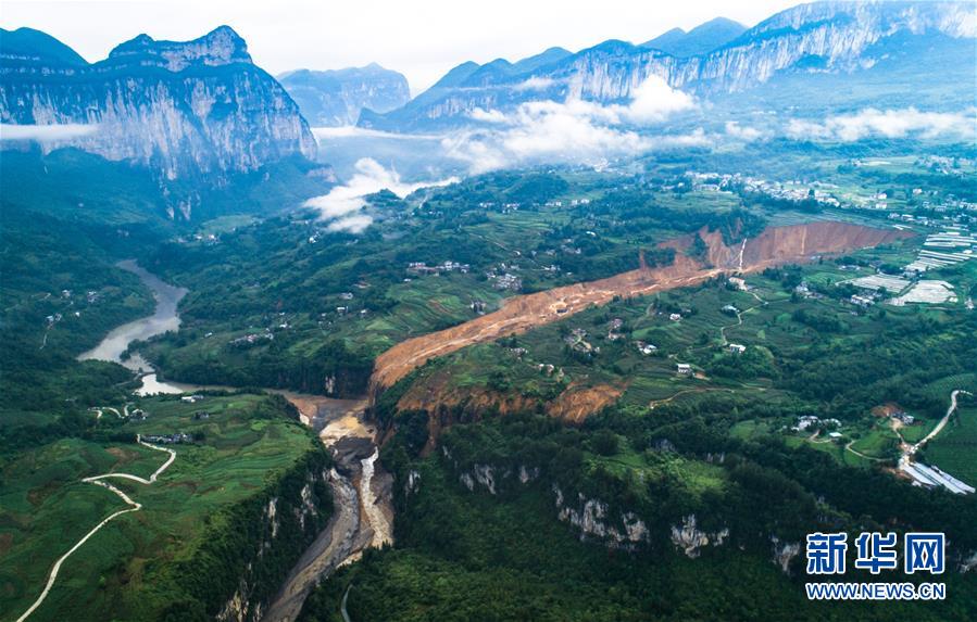 7月22日拍攝的因恩施州屯堡鄉(xiāng)馬者村山體滑坡形成的堰塞湖(無人機(jī)照片)。新華社記者肖藝九攝