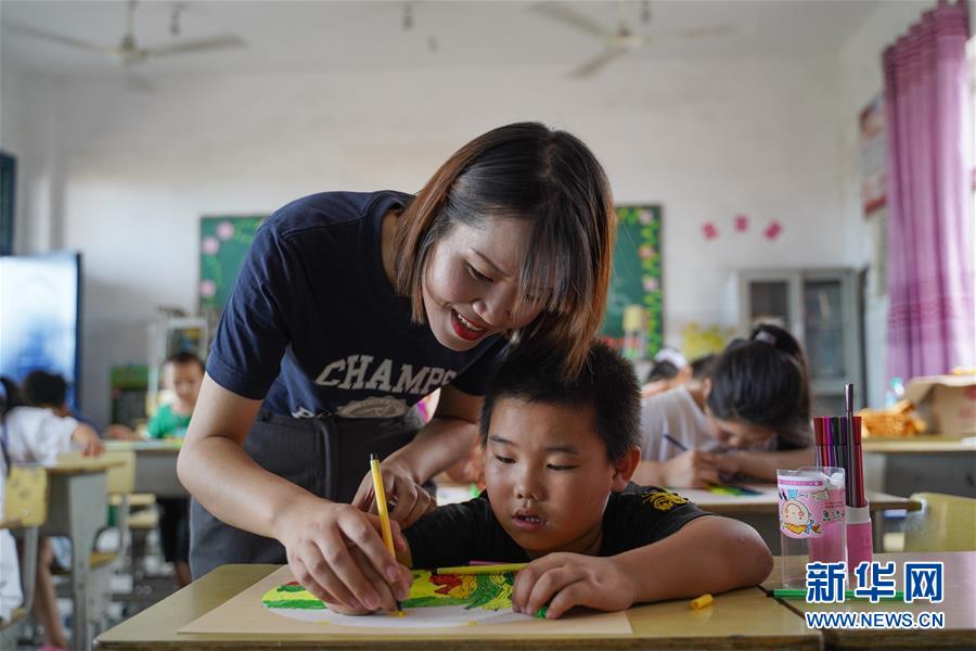 7月23日,在廬山市蛟塘鎮(zhèn)中心小學(xué)安置點(diǎn),一名老師在指導(dǎo)孩子繪畫。新華社記者張浩波攝