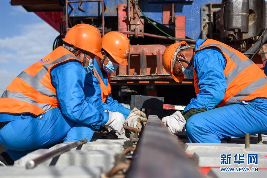 中鐵一局的施工人員在格庫鐵路新疆段固定最后一組軌排(7月21攝)。新華社記者 丁磊 攝