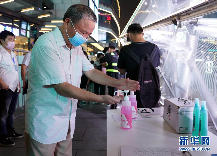 7月25日,在上海大寧音樂廣場,觀看露天電影展映的觀眾在入場前清潔手部。新華社記者 劉穎 攝
