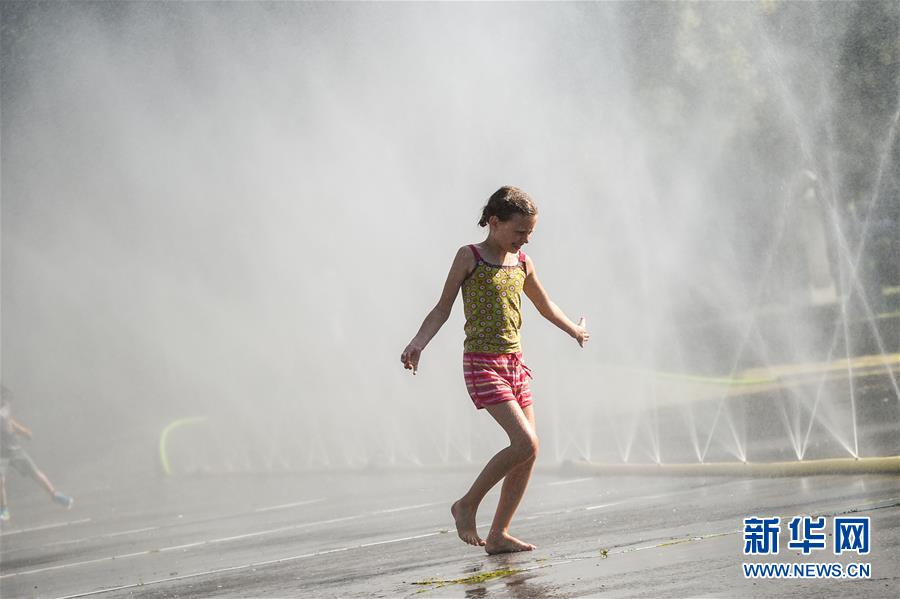 7月28日,在奧地利維也納,一名女孩在一處廣場戲水。新華社記者郭晨攝
