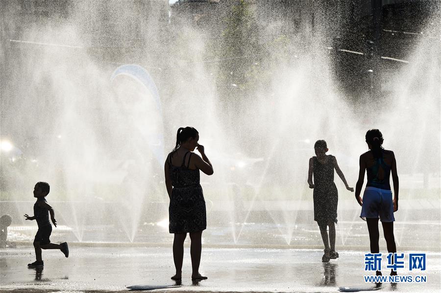 7月28日,在奧地利維也納,人們?cè)谝惶帍V場(chǎng)戲水。新華社記者郭晨攝