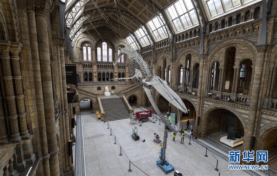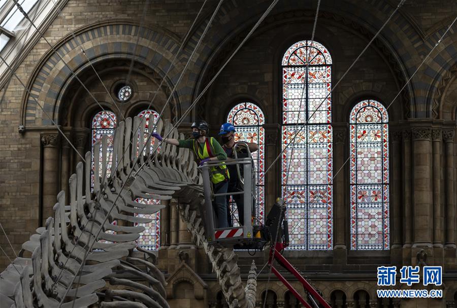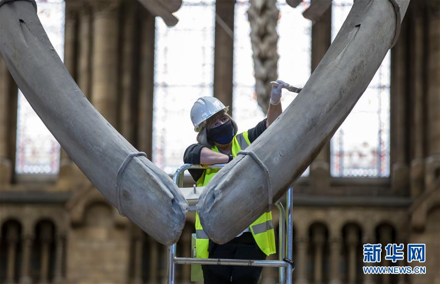 7月27日,工作人員在英國倫敦的自然歷史博物館大廳內清潔一具藍鯨骨架。受新冠疫情影響關閉數(shù)月的英國自然歷史博物館將于8月5日重新對外開放,目前館方正在為重新開放做最后準備。參觀者需要提前預約參觀時段、全程佩戴口罩且保持安全距離。新華社記者韓巖攝