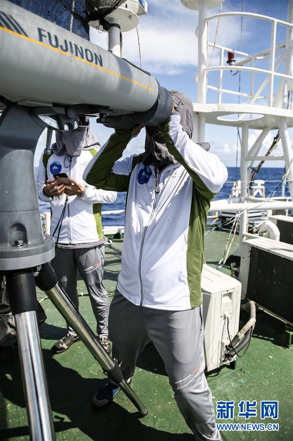 7月11日,科研人員在科考船上觀察動物。新華社記者張麗蕓攝