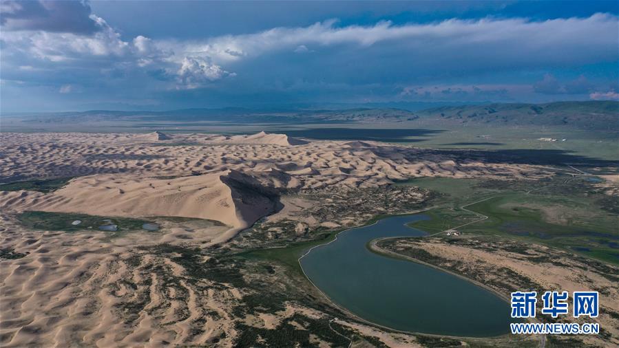 這是青海湖沙島風光(7月28日攝,無人機照片)。盛夏傍晚,位于青海湖東北部的沙島,島內(nèi)湖泊星羅棋布,沙丘連綿起伏,風景別致。金沙與湖水掩映,在陽光的勾勒下形成一幅美麗的畫卷。新華社記者張宏祥攝