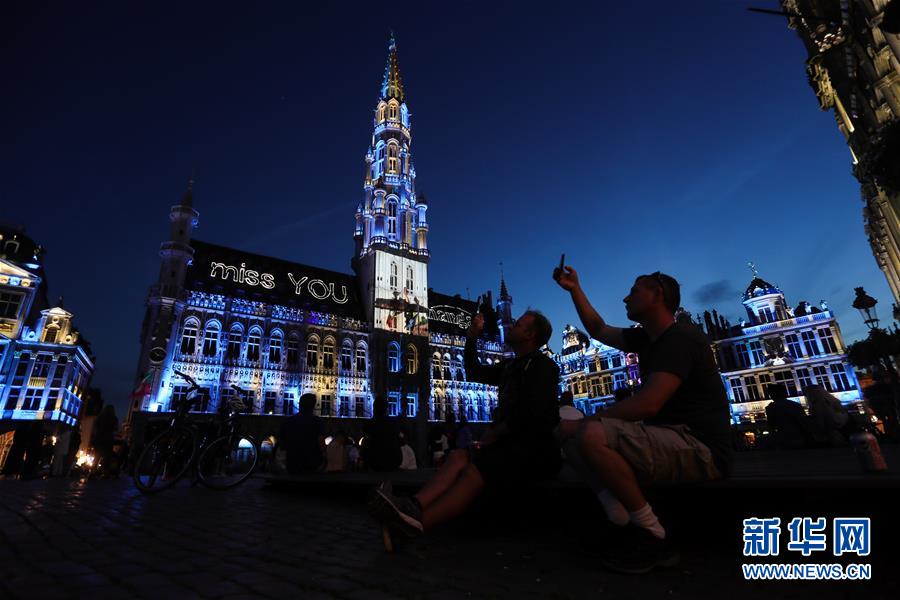 7月29日,比利時(shí)布魯塞爾大廣場(chǎng)的市政廳外墻上投射出“想念你,節(jié)日”的字樣。7月29日,比利時(shí)布魯塞爾大廣場(chǎng)舉行大型聲光秀。藝術(shù)家在市政廳等歷史建筑上投影文字和圖案,紀(jì)念這個(gè)夏天受新冠疫情影響而不能如期舉辦的文化活動(dòng)。新華社記者鄭煥松攝