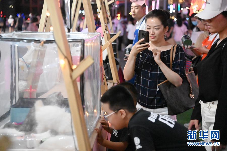 市民在“夜貓市集”上觀(guān)看寵物貓(7月29日攝)。新華社記者張浩然攝