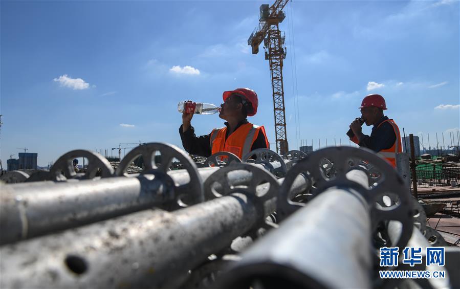 8月3日,工人在長江文創(chuàng)產(chǎn)業(yè)園項目工地休息喝水。進(jìn)入8月,武漢迎來持續(xù)高溫天氣。在湖北廣電傳媒基地工程的工地上,中建三局總承包公司1500多名工人持續(xù)奮戰(zhàn),力保工程進(jìn)度。該工程是我國中部地區(qū)首個國家級廣播影視媒體基地,由湖北廣電傳媒大廈項目、長江文創(chuàng)產(chǎn)業(yè)園項目、廣電生活配套項目三大板塊組成,總建設(shè)規(guī)模130萬平方米。自今年3月25日獲批正式復(fù)工以來,承建方克服困難,把因疫情影響耽誤的工期趕了回來,預(yù)計將按原計劃完成建設(shè)任務(wù)。新華社記者程敏攝