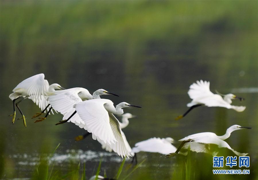 8月3日,白鷺在唐山南湖公園飛舞。近日,大批鷺鳥飛抵河北唐山南湖公園,在此覓食、嬉戲。唐山南湖公園所在地曾是因采煤沉降形成的廢棄地,經綜合治理,成為一座水域面積11.5平方公里、綠地面積16平方公里的生態(tài)公園。新華社記者楊世堯攝