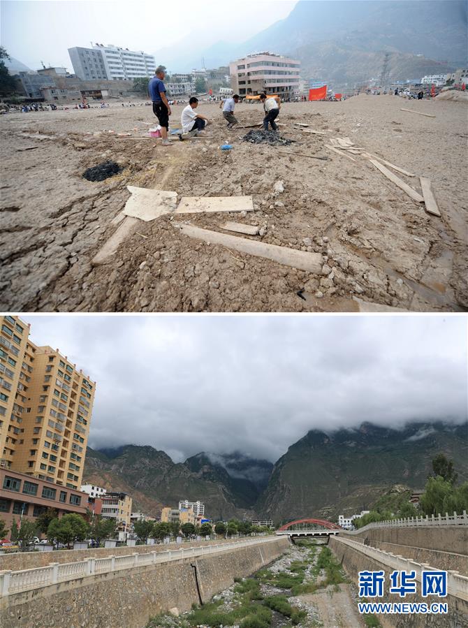 拼版照片:上圖為2010年8月11日,當(dāng)?shù)厝罕娫谥矍h月圓村的泥石中搜救被埋人員(新華社記者聶建江攝);下圖為2020年7月14日拍攝的月圓村山洪泥石流排導(dǎo)渠(新華社記者杜哲宇攝)。新華社發(fā)