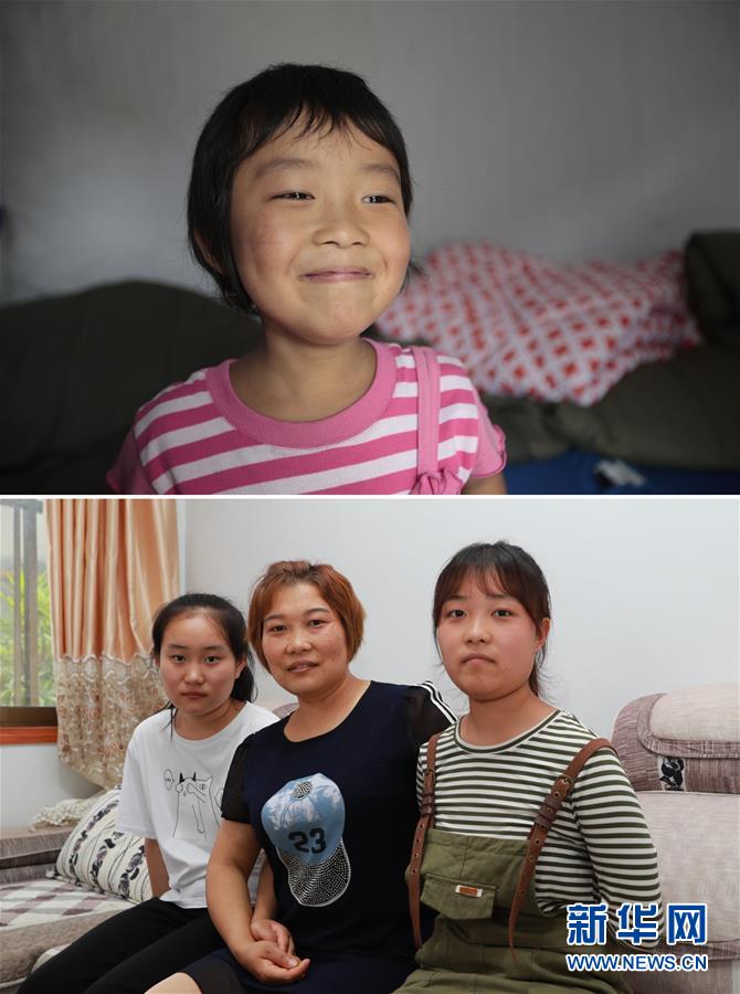 拼版照片:上圖為2010年8月20日,盼望開學(xué)的小雪梅在受災(zāi)群眾安置點的帳篷內(nèi)(新華社記者任正來攝);下圖為2020年7月14日,雪梅(右)和母親、妹妹在一起(新華社記者杜哲宇攝)。新華社發(fā)