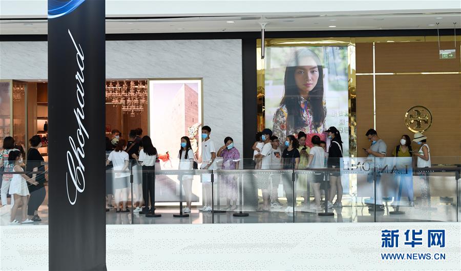 8月6日,游客在三亞國際免稅城排隊進店。新華社記者楊冠宇攝