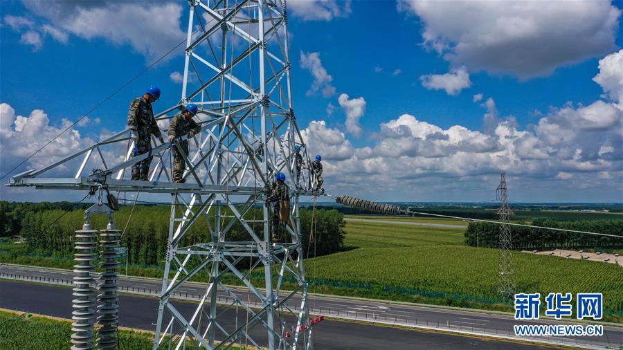 8月6日,幾名送電工在吉林省長(zhǎng)春市城郊的一處輸電鐵塔上施工作業(yè)(無人機(jī)照片)。吉林省長(zhǎng)春市連續(xù)多日出現(xiàn)高溫天氣,國(guó)網(wǎng)長(zhǎng)春供電公司輸電運(yùn)檢中心的送電工們每天清晨開始作業(yè),不畏烈日“烤”驗(yàn),堅(jiān)守工作崗位,確保工程按計(jì)劃完成。新華社記者張楠攝