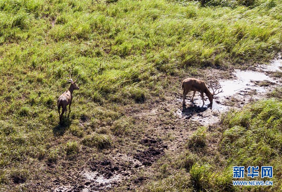 這是8月7日在東洞庭湖麋鹿和鳥類救治避難中心拍攝的麋鹿(無人機照片)。位于湖南省岳陽市的東洞庭湖麋鹿和鳥類救治避難中心成立于2016年9月,占地400余畝,中心自建成后就承擔起東洞庭湖區(qū)域全部麋鹿的救援、醫(yī)治、康復和喂養(yǎng)任務。目前該中心共有14只麋鹿正在接受救助。新華社記者李鑫攝