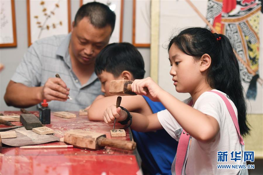 8月8日,小朋友在長沙市非物質(zhì)文化遺產(chǎn)展示館體驗(yàn)望城新康木雕技藝。新華社記者 薛宇舸 攝