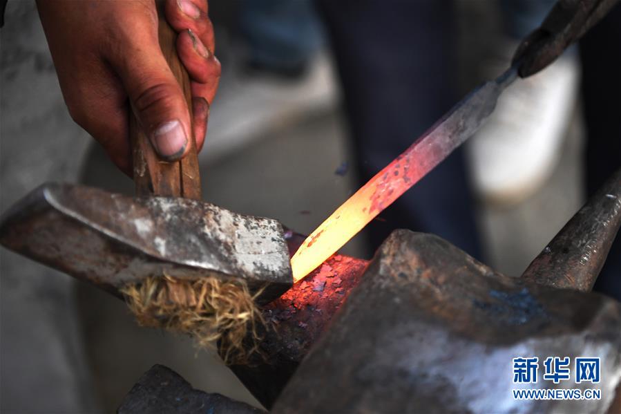 8月10日,甘肅省臨夏回族自治州積石山縣大河家鎮(zhèn)的村民馬有虎在制作保安腰刀。新華社記者陳斌攝。
