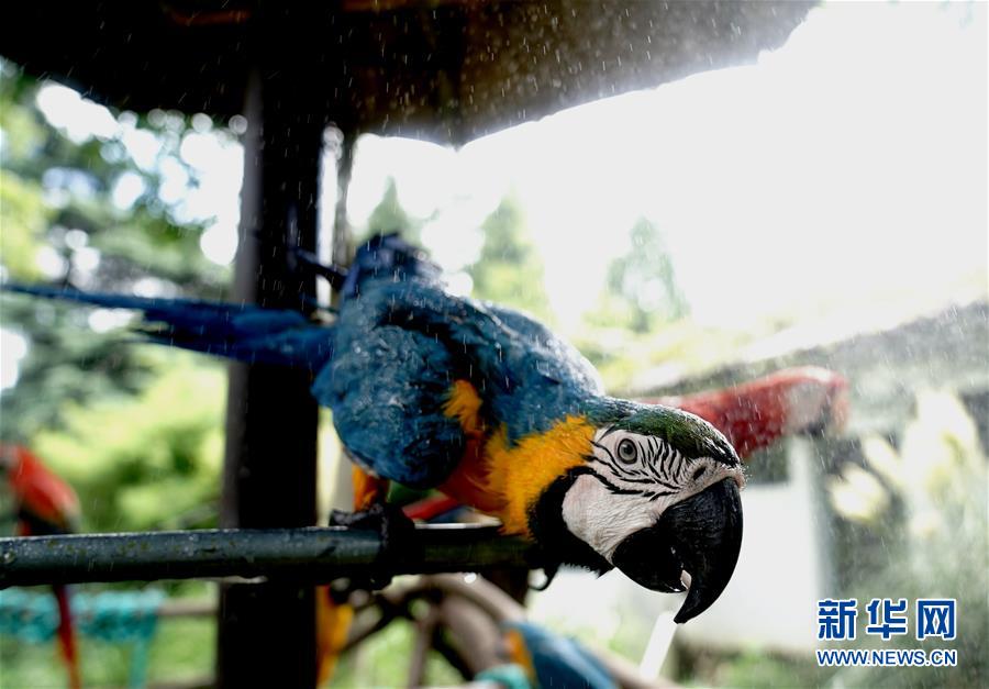 8月11日,上海動物園的金剛鸚鵡在享受噴淋降溫。當(dāng)日,上海最高溫度達(dá)到35攝氏度,上海動物園開啟園內(nèi)安裝的各種噴淋裝置,讓動物們防暑降溫,樂享清涼。新華社記者張建松攝