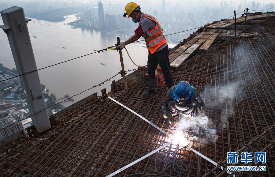 8月11日,工人在武漢綠地中心項目建設現(xiàn)場近500米的高空施工。新華社記者肖藝九攝