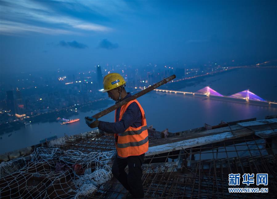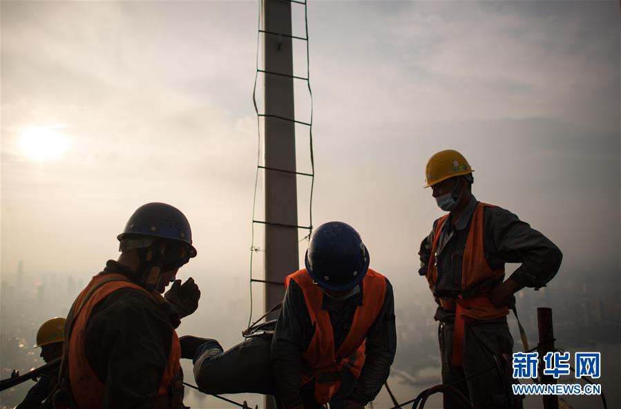 8月11日傍晚,工人在武漢綠地中心項目建設現(xiàn)場近500米的高空施工。新華社記者肖藝九攝