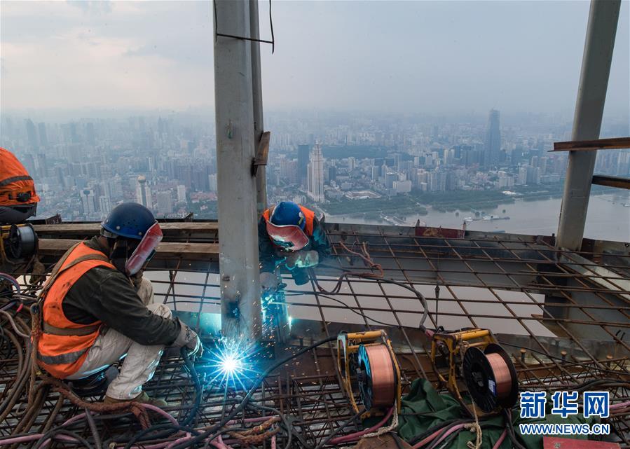 8月11日,工人在武漢綠地中心項目建設現(xiàn)場近500米的高空施工。新華社記者肖藝九攝