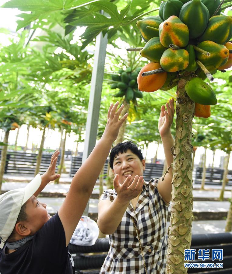 在吉林省永吉縣萬昌鎮(zhèn)宇豐紅果木瓜產業(yè)園,游客在大棚內體驗木瓜采摘(8月12日攝)。近年來,吉林省永吉縣萬昌鎮(zhèn)積極優(yōu)化農業(yè)產業(yè)結構,推進農業(yè)生態(tài)觀光采摘園建設,引進木瓜、香蕉等熱帶果品發(fā)展“南果北種”,助當?shù)剞r民開啟一條致富新路。新華社記者 許暢 攝