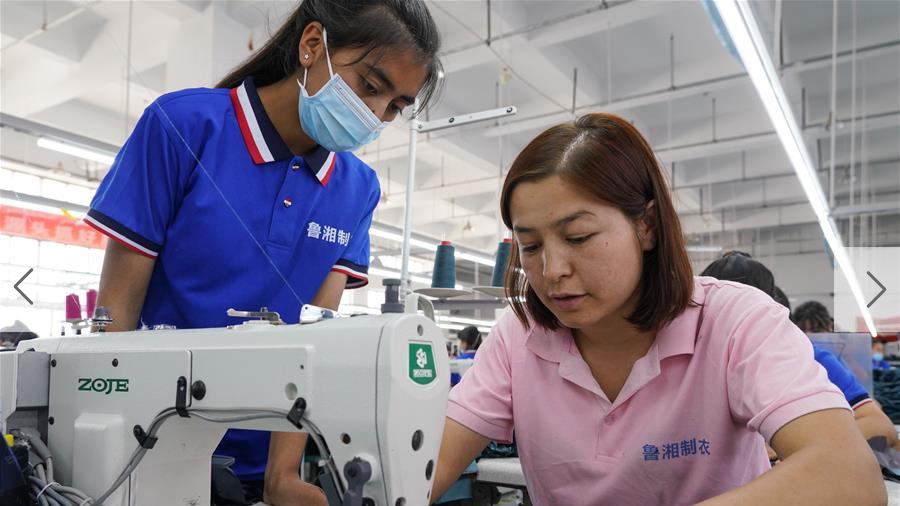 6月11日,在新疆喀什市一家服裝企業(yè)生產(chǎn)車間里,組長(zhǎng)艾尼皮古麗·玉麥爾(右)在指導(dǎo)工人縫制布料。