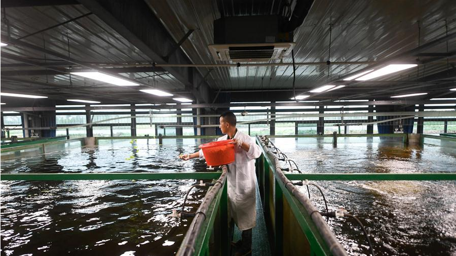 6月18日,技術(shù)人員在智能化循環(huán)水養(yǎng)殖車間進(jìn)行管理。