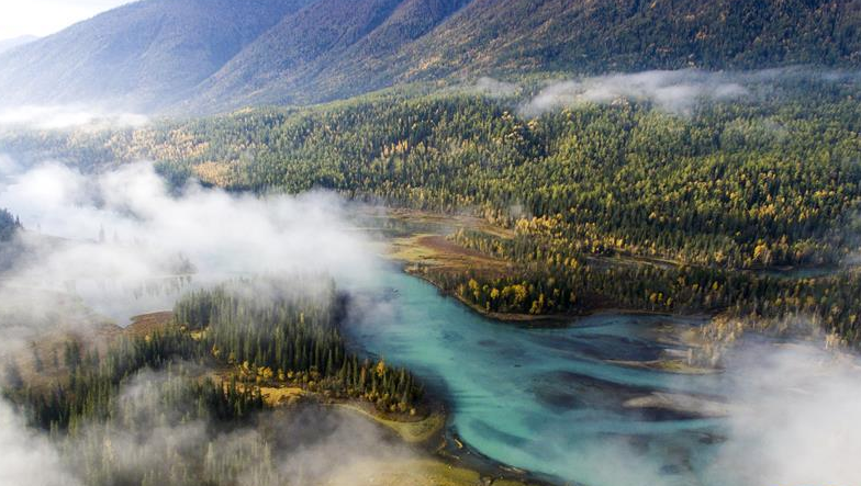 金秋時(shí)節(jié),位于新疆阿勒泰地區(qū)的喀納斯景區(qū)內(nèi)的林木與喀納斯湖相互映襯,美不勝收。