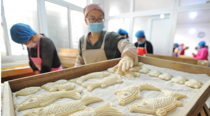 1月31日,河北黃驊市一家面花作坊的工人在查看面花。春節(jié)前夕,當?shù)孛婊ㄖ谱鞴S加班加點制作面花,供應春節(jié)市場。