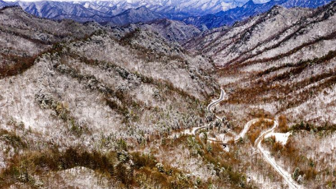 當日,秦嶺初雪,色彩斑斕的秋色在白雪映襯下,美如畫卷,置身其間,恍若進入童話世界