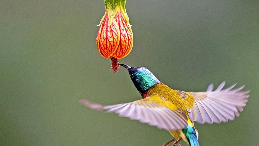叉尾太陽鳥嬌艷靚麗,懸鈴花造型優(yōu)美,花與鳥相映成趣,成為冬季榕城一道美麗的風(fēng)景。叉尾太陽鳥又叫“亞洲蜂鳥”,是福州的“明星鳥”。