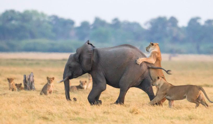 英國攝影師詹姆斯(James Gifford)在博茨瓦納喬貝國家公園拍到一群獅子獵食大象的精彩畫面。