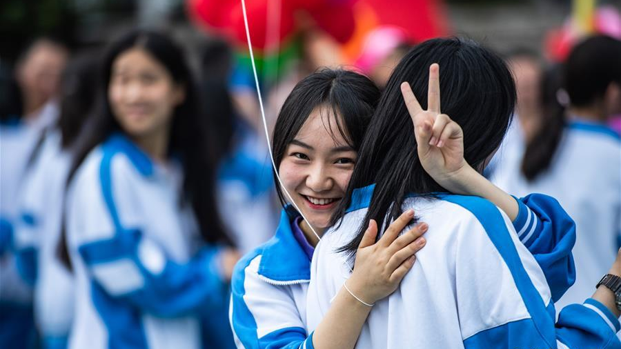 6月27日,烏當中學高三學生在畢業(yè)典禮上和同學擁抱。