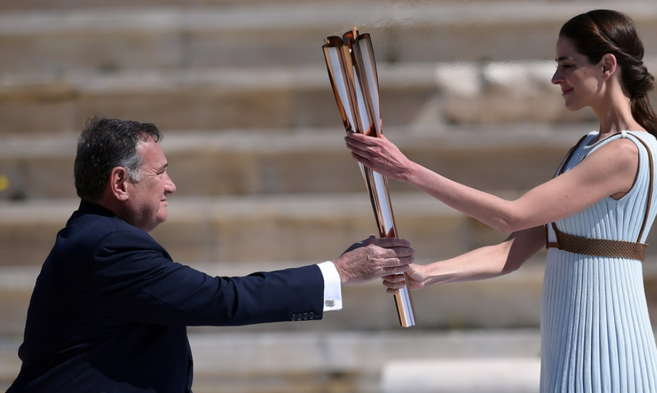 2020年3月18日,2020年東京奧運(yùn)會(huì)火炬交接儀式在希臘雅典帕納辛奈科體育場(chǎng)舉行。