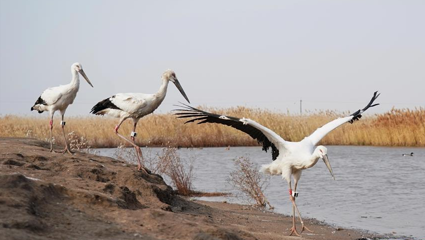 在樂亭縣野生動物保護協(xié)會大清河鳥類救助站,工作人員放飛國家一級保護動物東方白鸛。