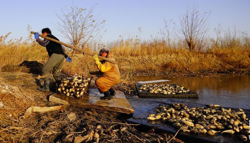 初冬時節(jié),河北省唐山市曹妃甸蓮藕豐收,工人們在結冰之前忙著采收蓮藕。
