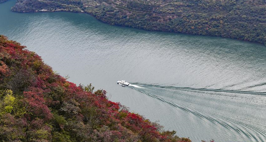 11月23日,游客在位于長江巫峽段的巫山文峰景區(qū)游覽。初冬時節(jié),位于重慶巫山縣境內的長江巫峽段呈現(xiàn)出一江碧水東流、兩岸層林盡染的秀美景象。